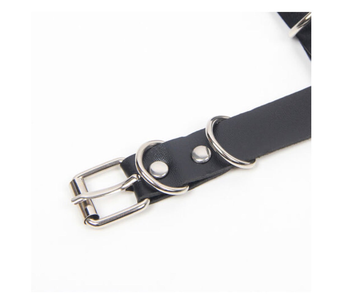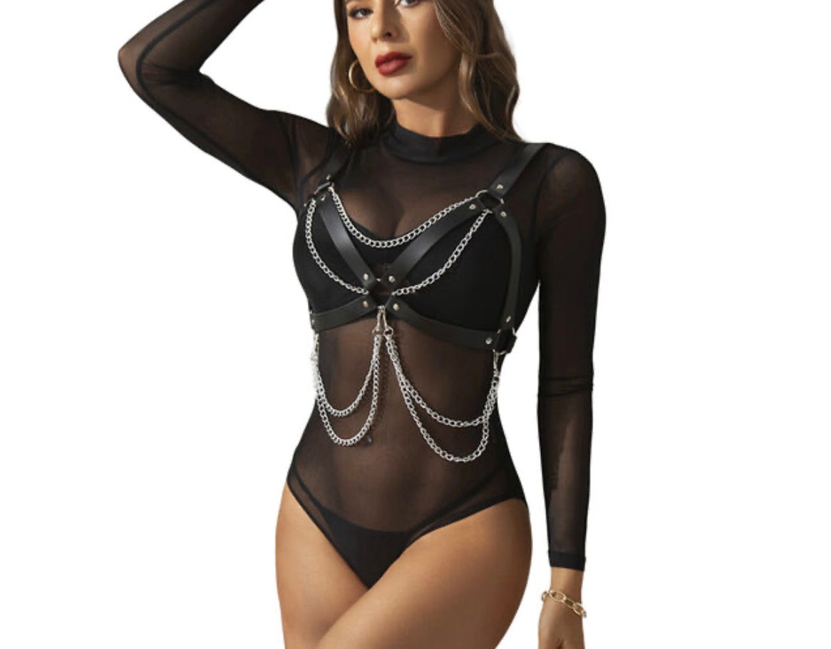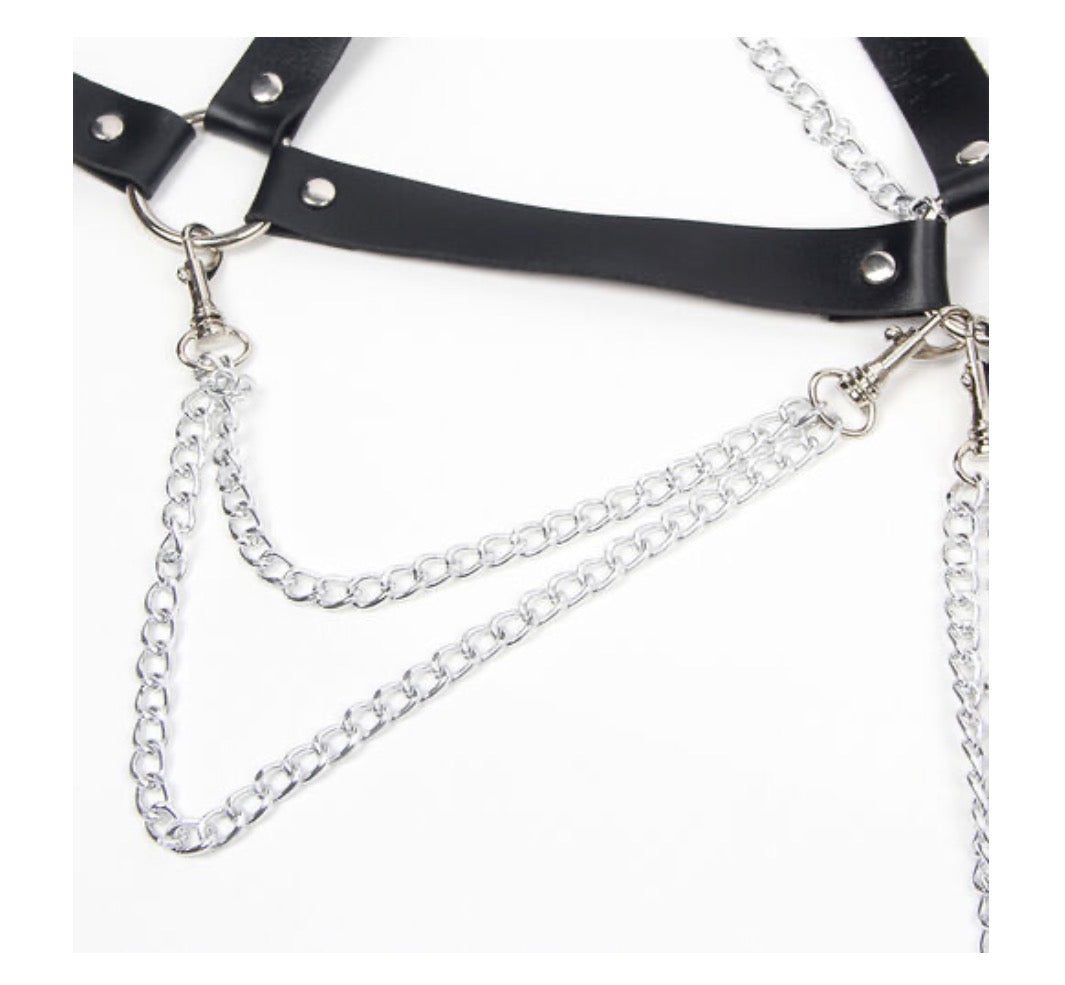 Ce harnais réglable en similicuir noir est agrémenté de chaînes à la taille et sur la poitrine.